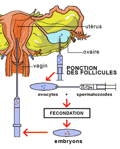 Trente-six heures après cette injection, les follicules ovariens, qui ont alors chacun un diamètre de 15 à 20 mm environ, sont ponctionnés. Ceci se passe habituellement sous anesthésie locale et le liquide contenu dans chaque follicule est aspiré à l’aide d’une aiguille guidée par une sonde d’échographie placée dans le vagin. C’est dans ce liquide folliculaire que le biologiste espère trouver les ovocytes matures nécessaires à la fécondation.